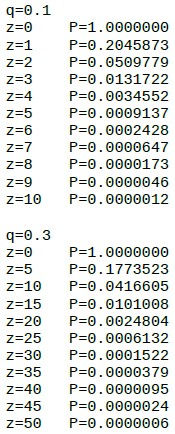 Ejecutando algunos resultados, podemos ver que la probabilidad disminuye exponencialmente con z.